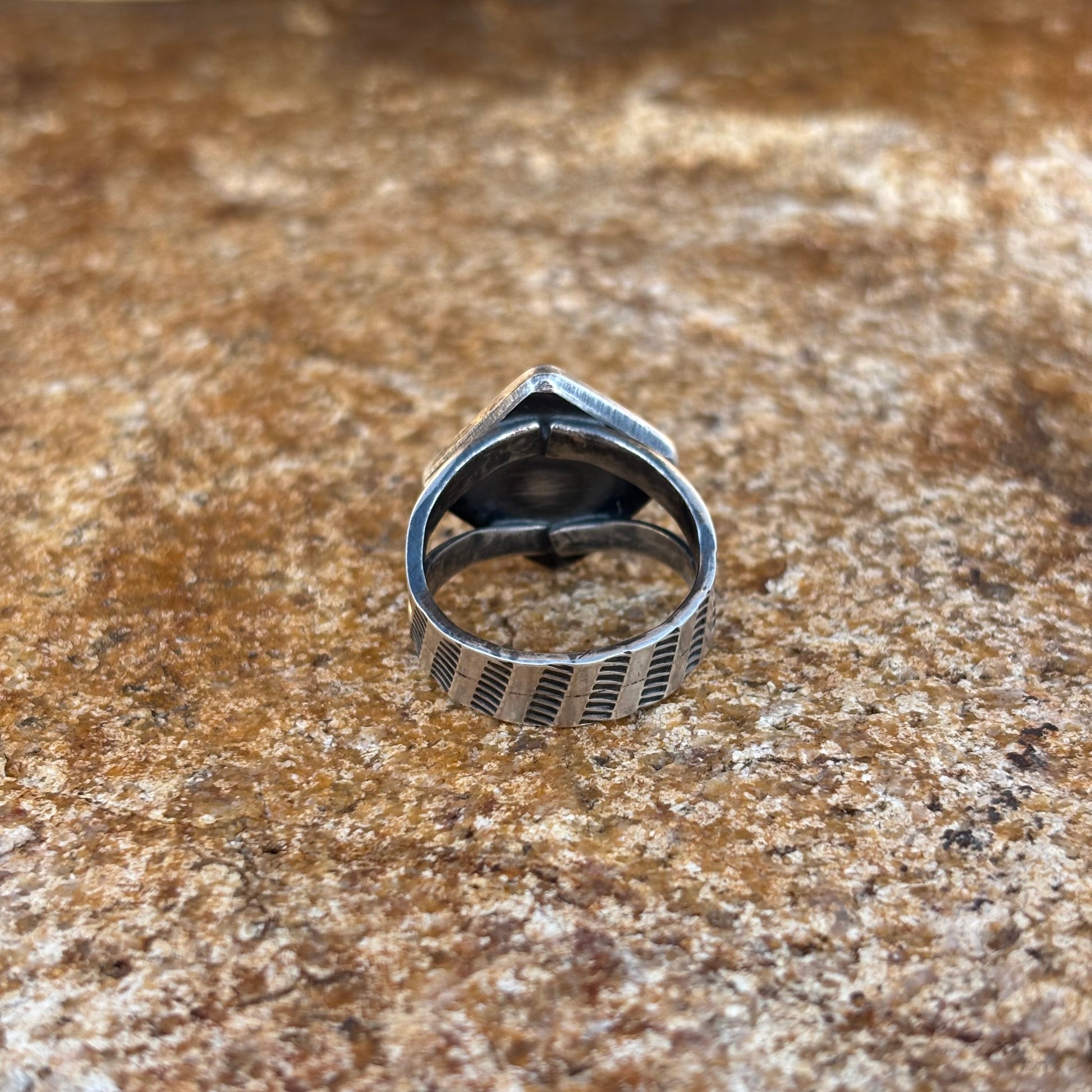 Constructed from .925 sterling sheet and wire. It is set with natural Kingman turquoise. it is not stamped sterling neither is it hallmarked.