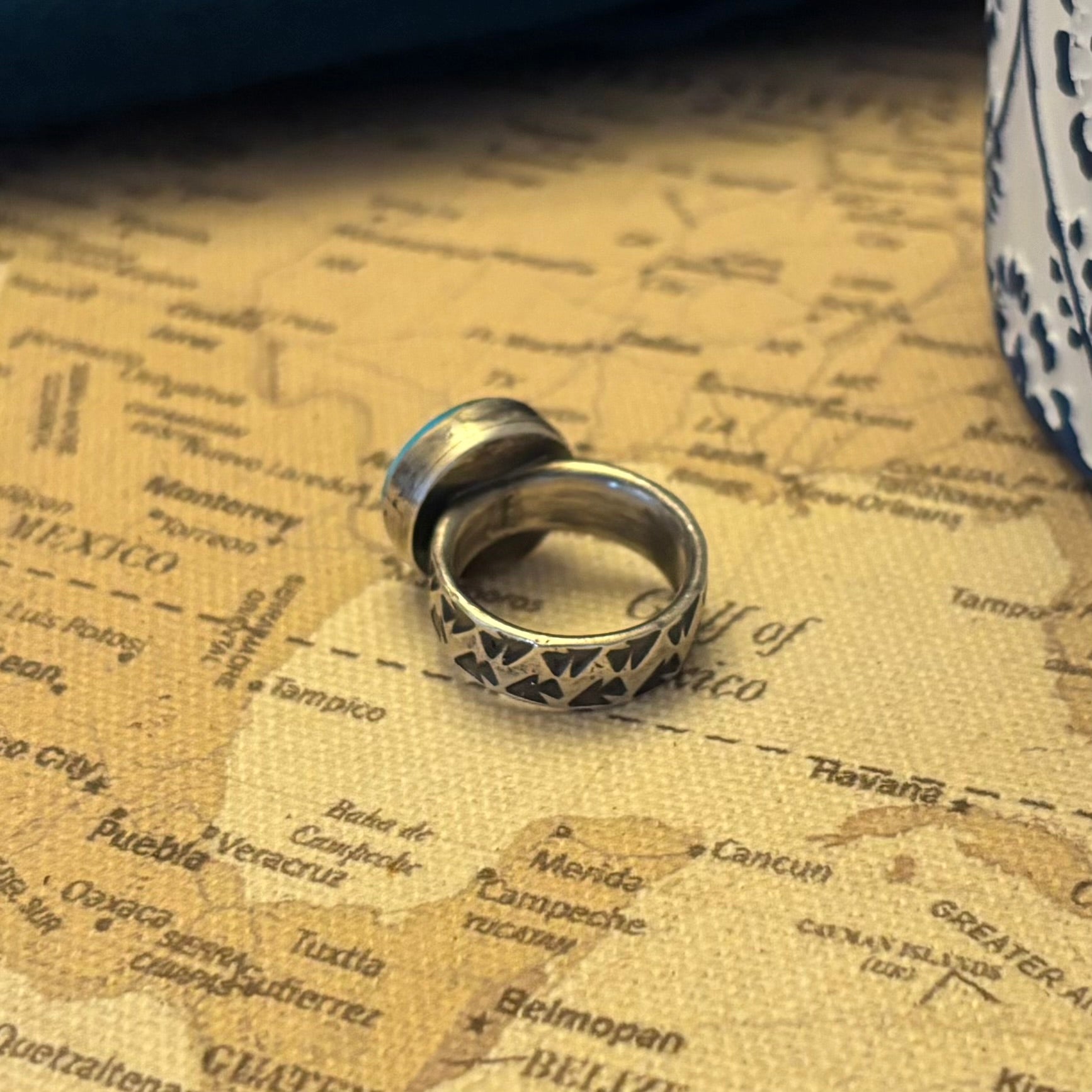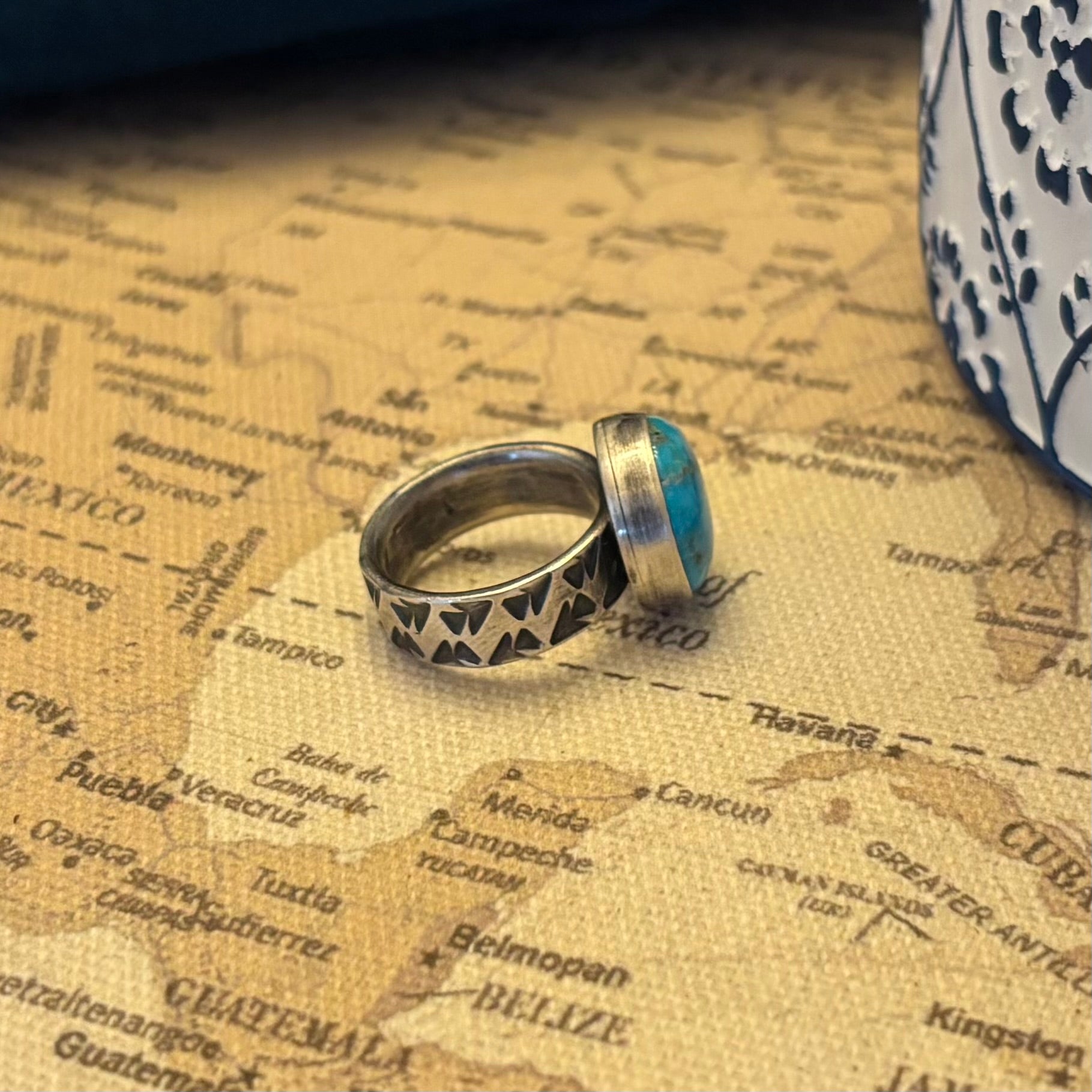 Constructed from tufa cast .925 sterling silver ingots and natural Kingman turquoise.