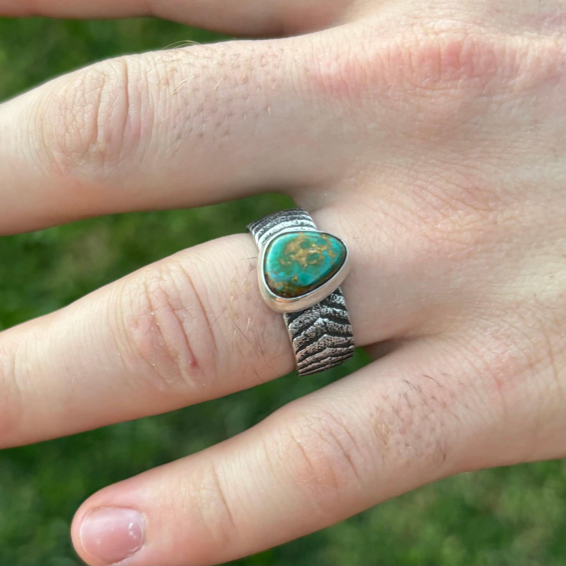 Cast from sterling silver using a hand carved cuttlefish bone, this ring features a beautiful natural Royston Turquoise stone. Not stamped .925, not hallmarked.