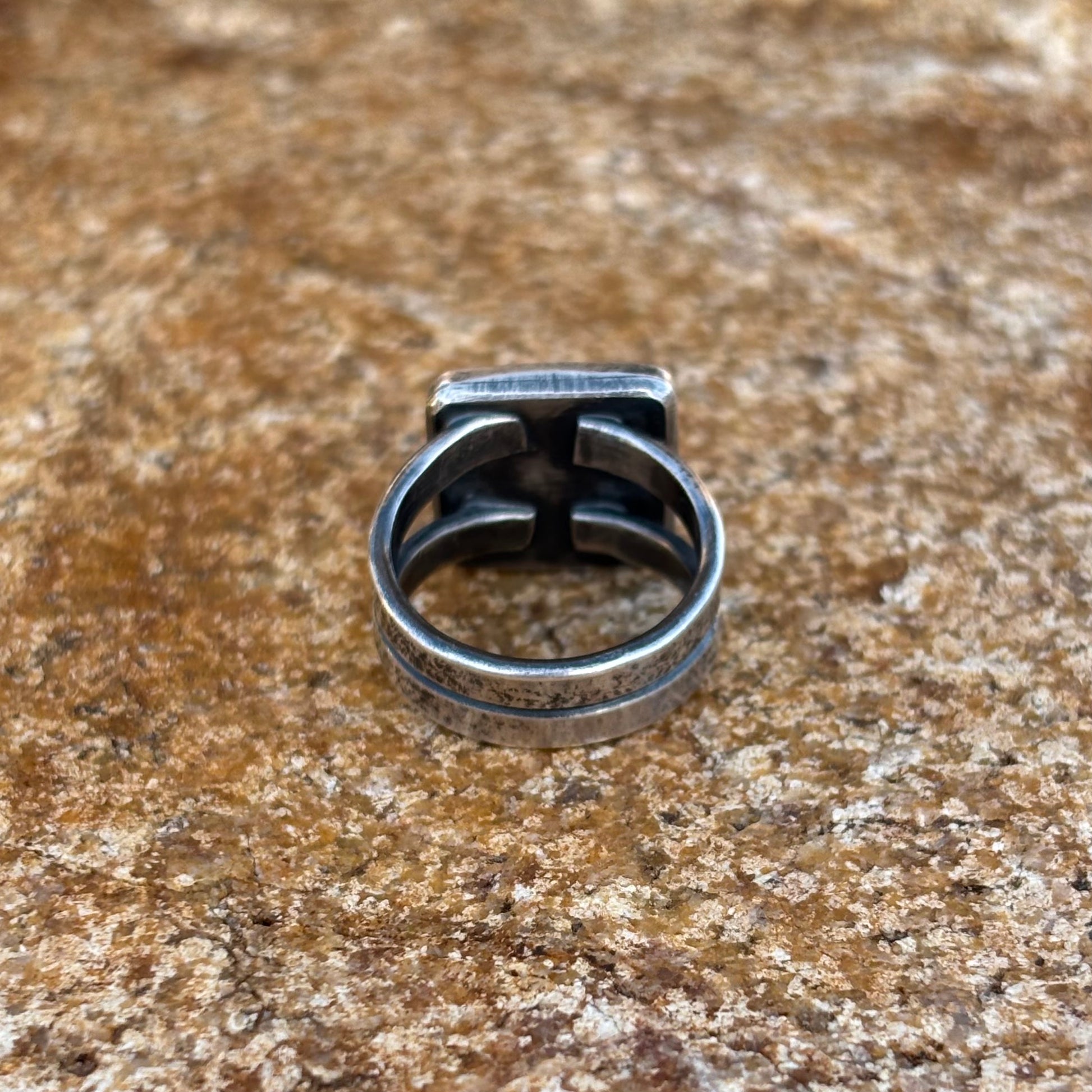 Unstamped ring shank. Constructed from .925 sterling sheet and wire. It is set with natural Kingman turquoise.